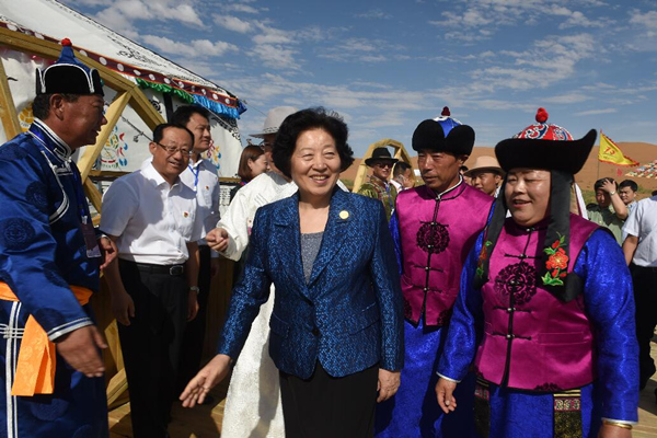 当日上午,孙春兰来到阿拉善越野e族英雄会会场考察沙漠旅游产业,对阿拉善发挥地理区位优势、创新推动旅游业发展的做法表示肯定。随后,孙春兰走进蒙古包,同牧民张辉生一家促膝交谈。听到张辉生通过开展特色旅游实现年收入几十万元,孙春兰很高兴。她说,习近平总书记十分牵挂内蒙古各族群众生产生活,你们生活好了,党中央就放心了。走出蒙古包,孙春兰观看沙漠那达慕赛马、赛驼、摔跤等民族特色表演,与各族群众亲切互动。 孙春兰前往佛教寺庙延福寺考察,同僧众亲切交流,向广大宗教界人士和信教群众表示问候。她希望宗教界人士认真学习落实全国宗教工作会议精神,发扬爱国爱教优良传统,坚持中国化方向,积极引导宗教与社会主义社会相适应,在维护社会稳定、促进民族团结方面继续发挥积极作用。 孙春兰会见阿拉善盟各族各界干部群众代表并合影。在出席阿拉善盟庆祝内蒙古自治区成立70周年座谈会时,孙春兰对阿拉善在发展特色优势产业、改善生态等方面取得的成绩予以肯定,称赞阿拉善为国家航天事业发展作出的贡献。她说,阿拉善素有“苍天圣地”美誉,是祖国北疆重要安全稳定屏障,战略地位十分重要。各级干部要深入学习贯彻习近平总书记系列重要讲话精神和治国理政新理念新思想新战略,认真领会落实习近平总书记“7·26”重要讲话精神,加快经济转型步伐,提高效益和质量,切实保障改善民生,坚决守好生态红线,深入推进民族团结,使各项事业再上新台阶,让各族人民生活更幸福,建设亮丽内蒙古,共圆伟大中国梦。 下午,孙春兰前往阿拉善大漠奇石文化产业园考察,同在产业园就业的农牧民和下岗再就业职工亲切交流。自治区政协主席任亚平,自治区党委常委、统战部部长王莉霞陪同。 |
