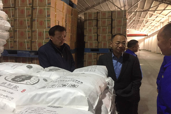 313上午,集团公司党委书记、董事长孙刚德、总经理李奎锦上任伊始,便带领公司主管生产副总经理徐宪国,以及生产技术部、市场营销部、精盐分厂、采盐分厂负责人深入精盐分厂食用盐生产车间、中心化验室、原盐生产一线、放销现场调研,详细了解了原盐和食用盐生产工艺、产品种类、市场区域、销售价格等情况。