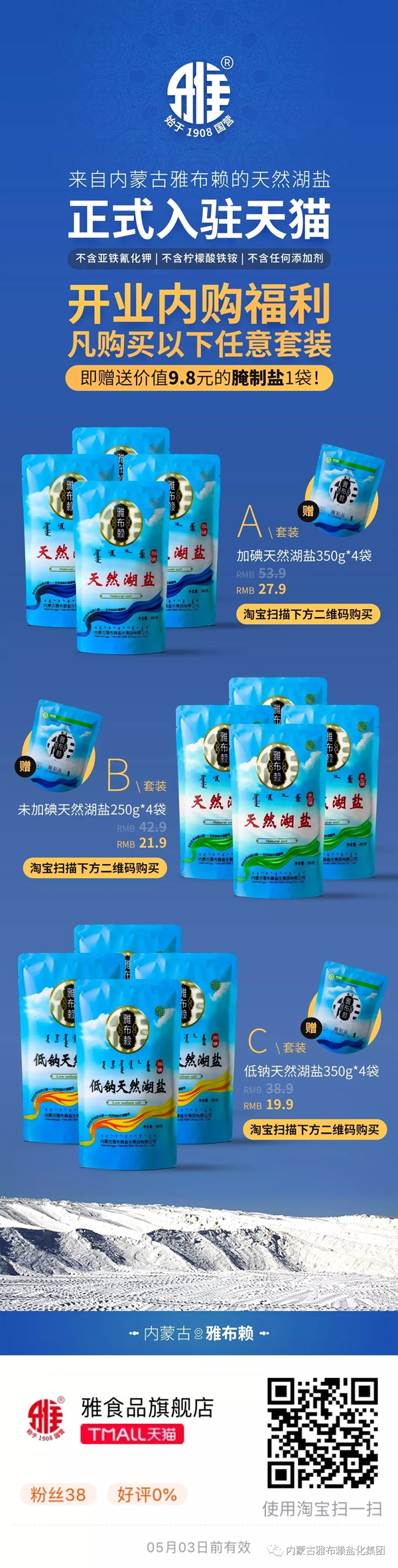电商公司通过京东的层层严格审核,雅盐天猫旗舰店于4月1日隆重开业。自此,雅盐食用盐、洗涤盐系列8个单品全部上线销售,分别为:大青盐(320g)、低钠天然湖盐(350g)、未加碘天然湖盐(250g)、天然湖盐(350g)、腌制盐(400g)、精制盐(400g、2500g)、果蔬洗涤盐(320g)。 现在,消费者只需在淘宝输入“雅布赖盐”、“雅食品旗舰店”或使用淘宝扫描上图二维码,即可找到由开云体育-开云kaiyun(中国)